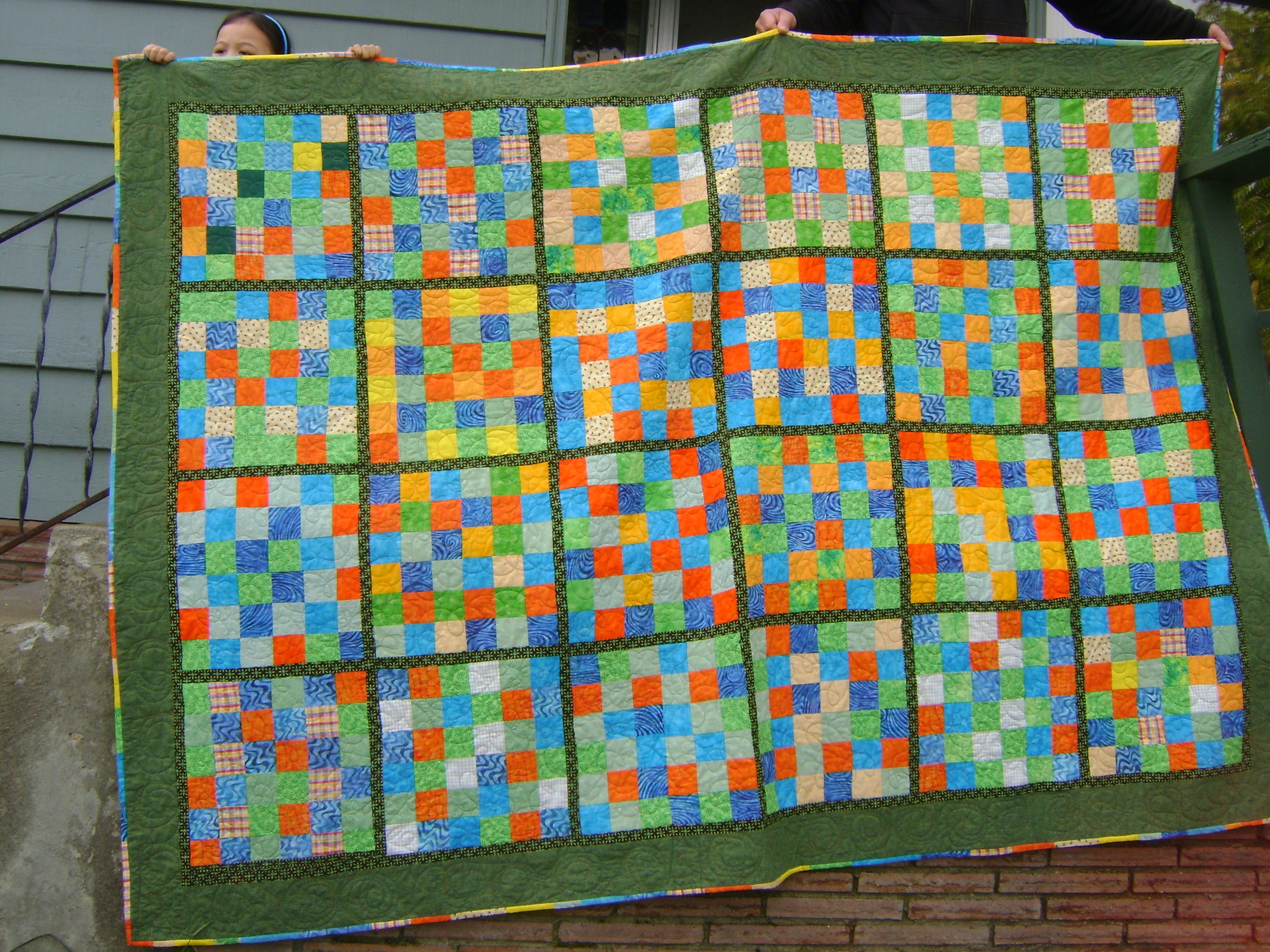 I was taking a chemistry class for the first time in my life, for fun. Most college students thought I was nuts taking chemistry for fun. Anyway, there was a cool colorful picture at the beginning of one of the chapters in our text which had nice sky blue tiles on top of which was an overflowing bowl of oranges, tangerines, and limes. The combination of colors was striking, so I tried to use those colors and others as a the theme in my new quilt.