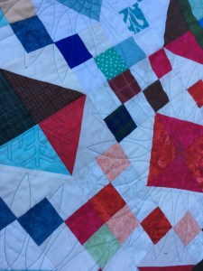 I leaped into action, made a quick choice on which design to use, and colors to include. I had to finish the last block at her house using one of her sewing machines, and then had to decide quilting designs to use with my blocks, border and other spots on the quilt. The main design was a star-like/sunflower-like large design for my large blocks, a snowflake-like design for smaller squares, and a wavey fun design for the border. It turned out fantastic. The binding is almost finished.